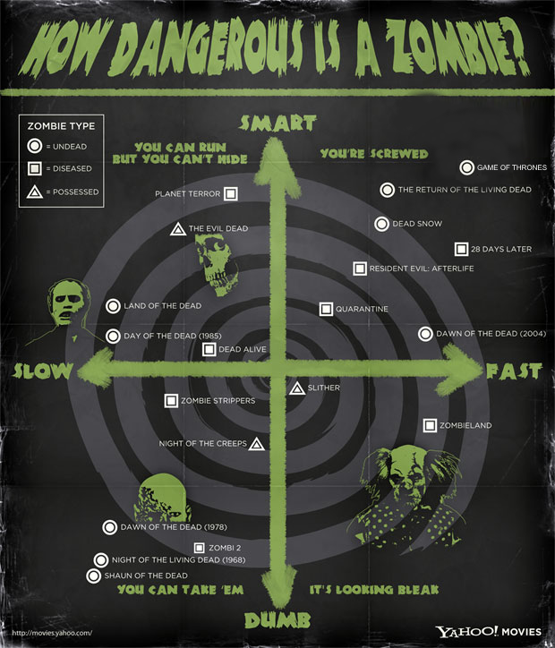Source: YAHOO! MOVIESThis charts zombie movies based on their speed (horizontal axis) and their intelligence (vertical axis). Besides being hilarious and entertaining it’s also informative for how floating point vectors work. It allows us to convert a mushy humanoid sentiment like, “I would not want to mess with the GoT zombies” to raw emotionless data of [10, 10] which represent the x, y coordinates for Game of Thrones on the chart (assuming a 10pt scale).