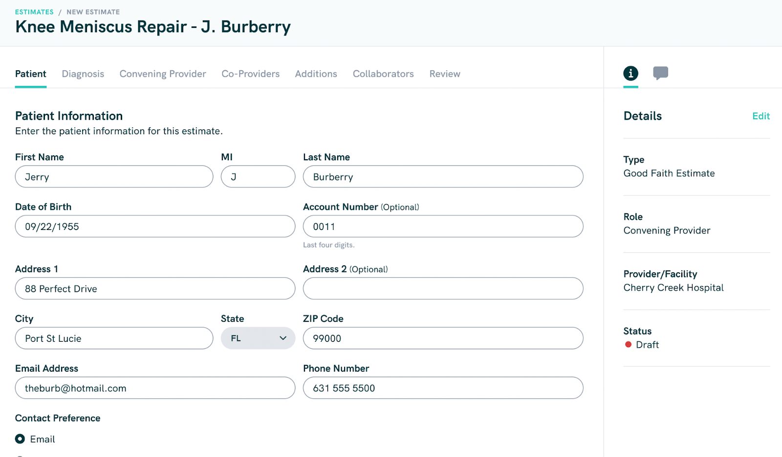 Instant GFE workflow: Input patient information. We hope Jerry's OK.Dashboard to Manage All GFEs: Track GFEs along their workflow journey, from initial request through delivery to the patient.