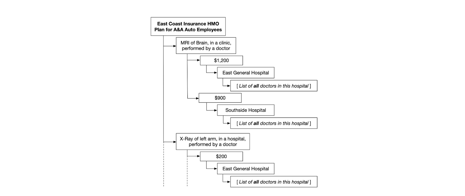 Schema Design: In the current CMS mandated schema, payers associate rates with all providers at a facility, which leads to physicians being associated with services they may not be associated with. Turquoise CTO Adam Geitgey wrote about this issue earlier, and he included a visual that shows the magnitude of the repetition caused by the schema design.