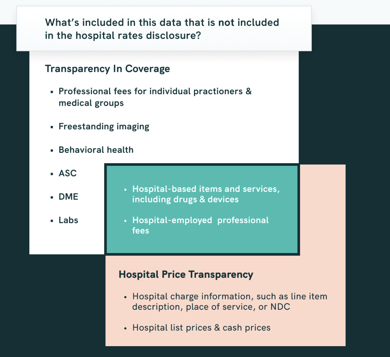 The first MRF portion of this mandate goes into effect on July 1, 2022, with the second estimate tool portion going into effect on January 1, 2023. Now, if you were a good pupil, you might remember that TiC has a fraternal twin named The Hospital Price Transparency Rule. The Hospital Price Transparency Rule applies to hospitals and mirrors the mandates set forth in TiC. There are a couple of key differences between our twins. The most obvious is that each ruling applies to a different group (TiC to payers, Hospital Price Transparency Rule to, well, hospitals). The Hospital Price Transparency Rule is already in effect and has been since January 1, 2021. And, each rule stipulates different contents per MRF. The Hospital Price Transparency Rule requires all negotiated prices for hospital services (as well as cash and list prices), while TiC requires all negotiated prices for hospital services, as well as every other care location (urgent care, ASC, imaging center, professional, etc). So basically, the cinematic universe of transparent prices has expanded from just hospital services to ALL healthcare services.