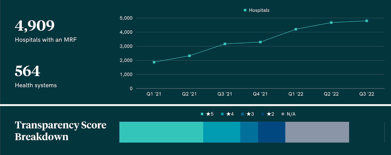 “65% of hospitals have posted a machine readable file...3,234 (52%) of hospitals have published complete or mostly complete files” (Turquoise Price Transparency Impact Report, October 2022)