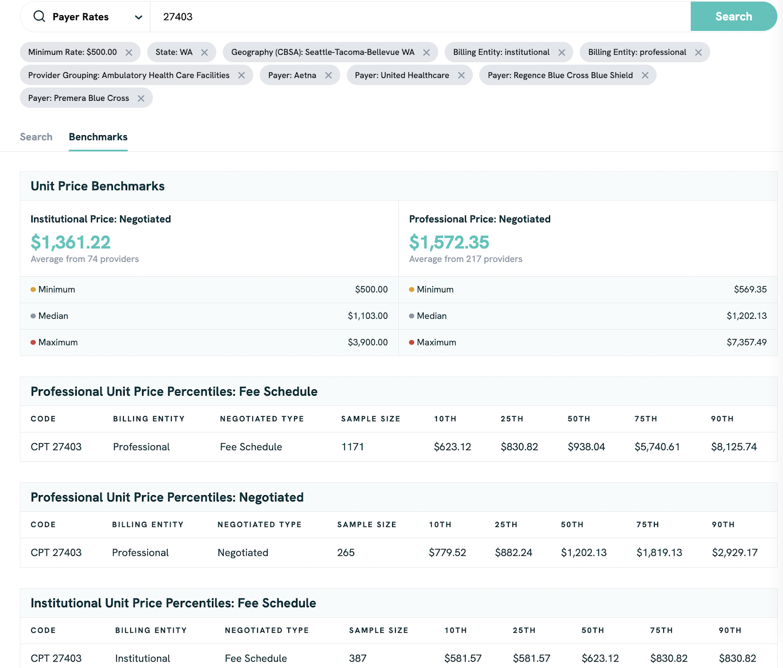For example, say you’re a Tacoma, WA-based surgery center and you suspect you're being underpaid for an arthrotomy with meniscus repair (CPT 27403). To figure out if you’re actually being underpaid, what you need are 27403 rates for Tacoma, WA from the payers you’re contracted with.