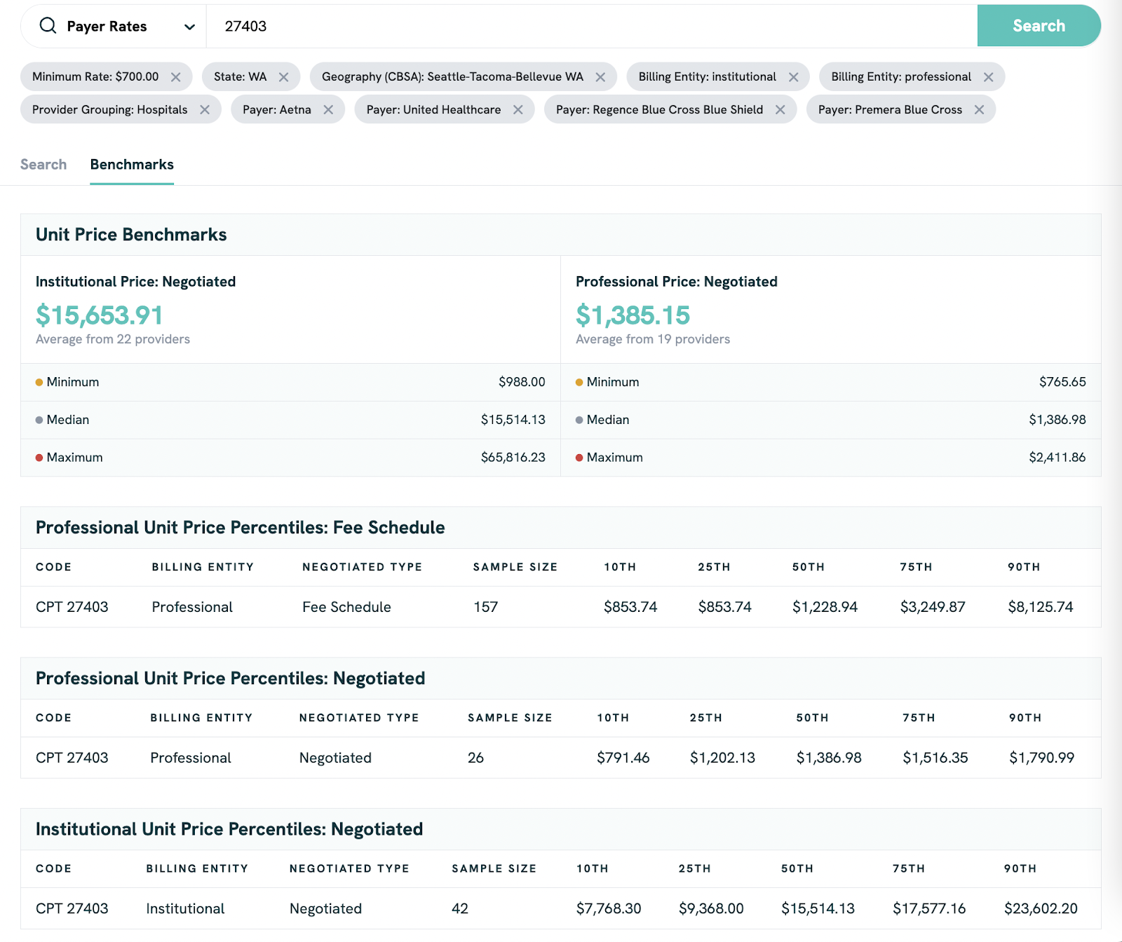 Payer Rates for 27403 for HospitalsWe can see a pretty significant difference in rate! This probably won’t surprise you since ASCs are typically paid less for the same service than hospitals. But that’s a pretty big discrepancy. You could either dig deeper and toggle to the “Search” tab and look at exact rates by hospital. There you could look at the differences in rate by institution by payer. Or, you could simply take the benchmark rates and do some connecting. Are most of your contracted rates with the payer paying the lowest amount for the same service regardless of the provider group? Or are you getting significantly lower than your neighbors from the same blue-shielded payer?