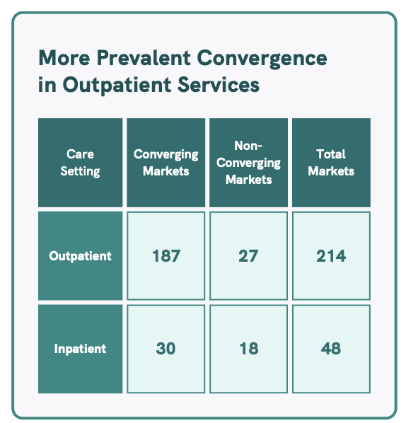 As price transparency takes off, increased competition is driving changes in provider pricing strategies. One of the most significant trends we’ve uncovered is the difference between outpatient and inpatient services. Outpatient services are seeing greater price convergence, with rates converging in 87.4% of the markets we studied. By contrast, inpatient services are lagging, with only 62.5% of markets showing similar patterns.
