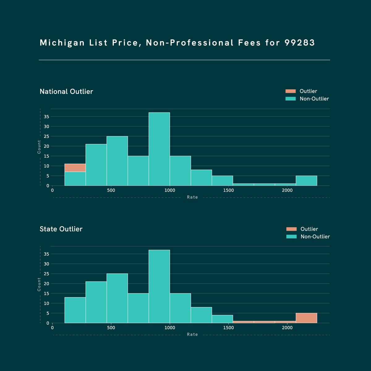 We started by cutting the data via different columns and categories. When we looked at the distribution of published rates by cohort, we immediately saw compelling indicators of normal vs. outlier rates when we included geographical groupers in the model. The graph below illustrates the distribution of published rates for commercial, non-professional fees for CPT code 99283 in Kentucky. The orange bars represent rates that we define as outliers.