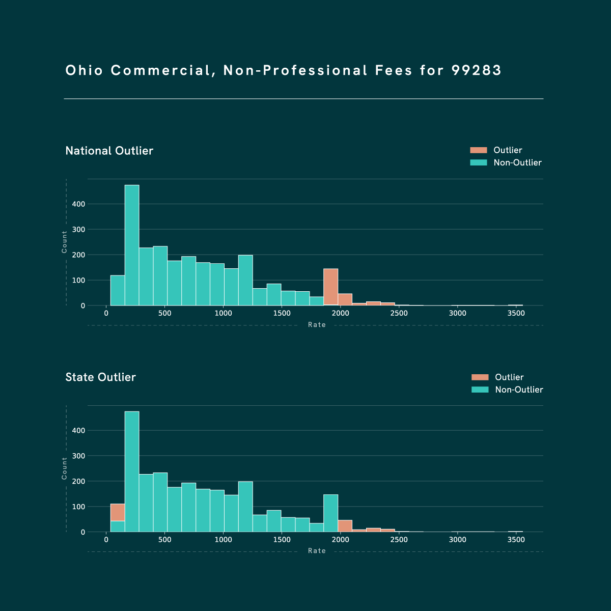 Ohio Commercial, Non-Professional Fees for 99283Looking at the commercial, non-professional fees for the same CPT in Ohio, we can see an instance of a state with high-ish charges for this CPT. Including the state in the outlier calculation releases some higher charges from outlier-hood.