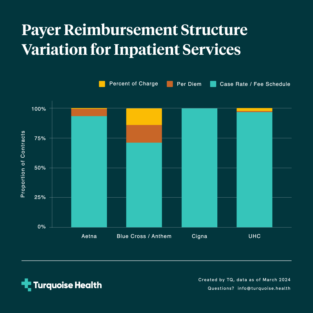 Blue Cross (69%) and Aetna (65%) have a lower proportion of fixed outpatient rates and relatively more percent-of-charge agreements.Payer reimbursement structures can differ for a variety of reasons: