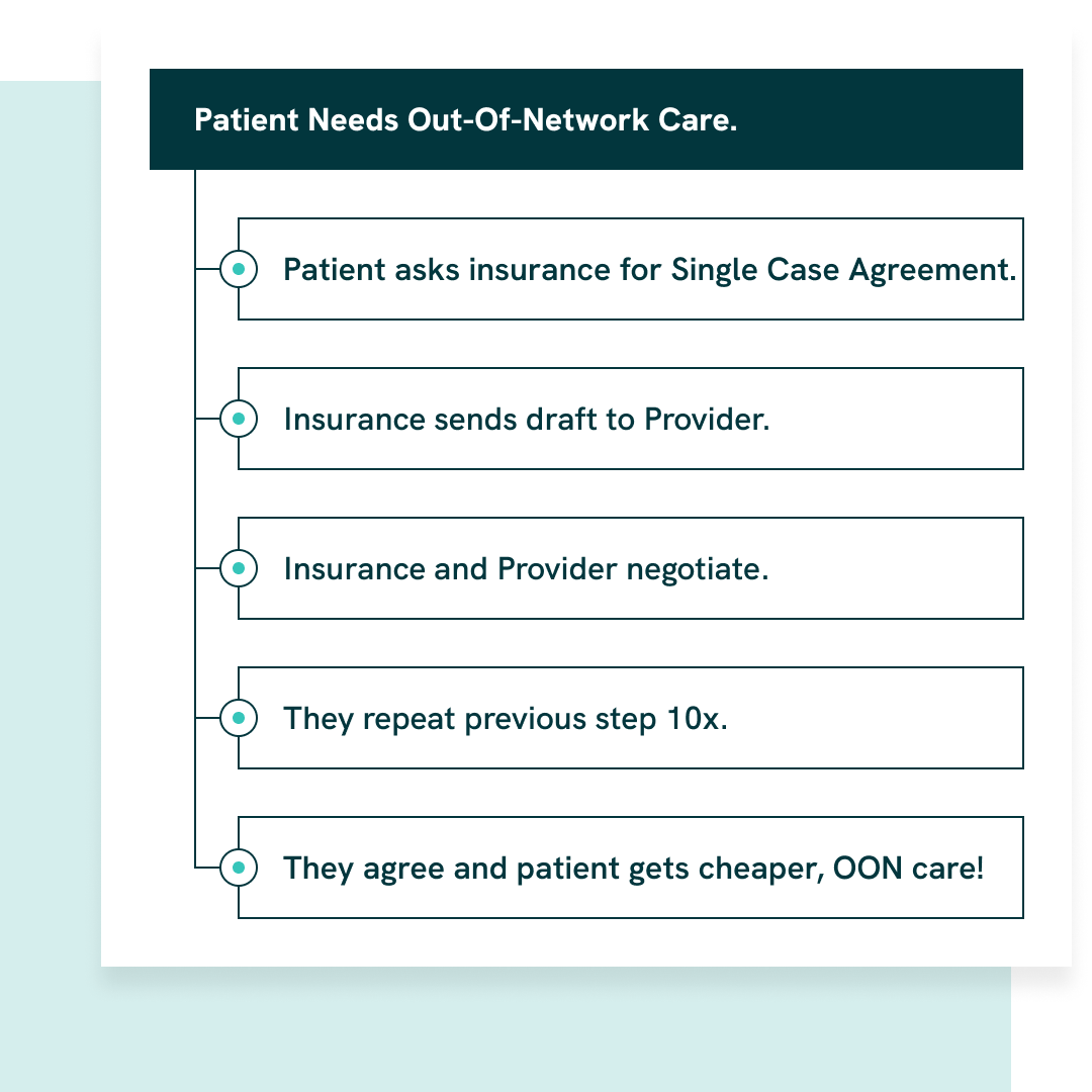 Obviously, Ted is in a fictional world and the rest of us aren’t. The closest we can get to finding out-of-network therapy as smoothly as Ted does is with something called Single Case Agreements (SCA’s).
